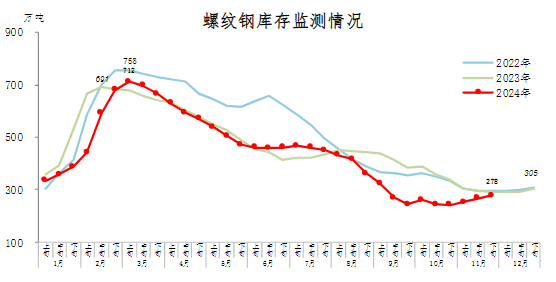 11月下旬,螺紋鋼庫存278萬噸,環(huán)比增加11萬噸,上升4.1%,庫存連續(xù)上升;比10月下旬增加36萬噸,上升14.9%;比年初減少27萬噸,下降8.9%;比上年同期減少15萬噸,下降5.1%。