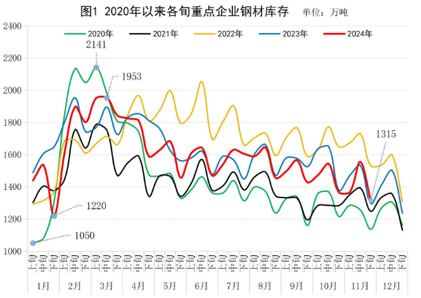 2024年11月下旬,重點(diǎn)統(tǒng)計(jì)鋼鐵企業(yè)(以下簡(jiǎn)稱(chēng)“重點(diǎn)企業(yè)”)鋼材庫(kù)存量1315萬(wàn)噸,環(huán)比上一旬減少240萬(wàn)噸,下降15.4%;比年初增加79萬(wàn)噸,增長(zhǎng)6.4%;比上月同旬減少49萬(wàn)噸,下降3.6%;比去年同旬增加19萬(wàn)噸,增長(zhǎng)1.5%,比前年同旬減少215萬(wàn)噸,下降14.1%(見(jiàn)圖1)。