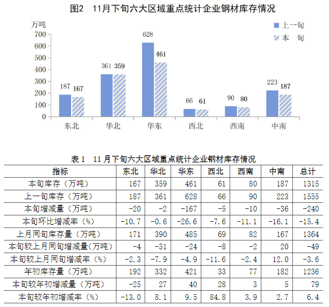 11月下旬六大地區(qū)重點(diǎn)企業(yè)鋼材庫(kù)存較上一旬均有不同程度下降(見(jiàn)圖2、表1),具體情況為:?東北地區(qū)鋼材庫(kù)存減少20萬(wàn)噸(-10.7%),主要與遼寧省庫(kù)存減少19萬(wàn)噸(-11.8%)有關(guān)。