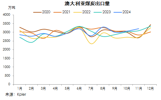 今年1-11月份,澳大利亞煤炭出口量累計(jì)3.29億噸,同比增2.71%。