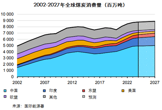 報(bào)告預(yù)計(jì),到2027年前,全球煤炭需求預(yù)計(jì)將維持區(qū)間內(nèi)窄幅波動(dòng)。盡管印度和東盟國家需求增長抵消了歐盟和美國的下降,但中國仍是全球煤炭需求的主要決定因素。