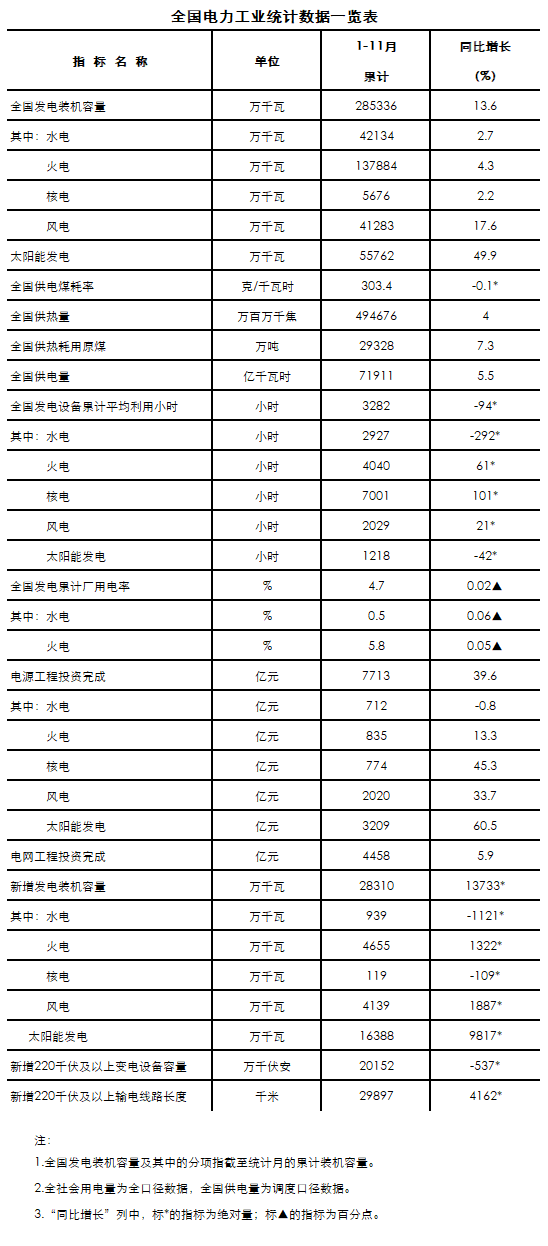 12月20日,國家能源局發(fā)布1-11月份全國電力工業(yè)統(tǒng)計數(shù)據(jù)。