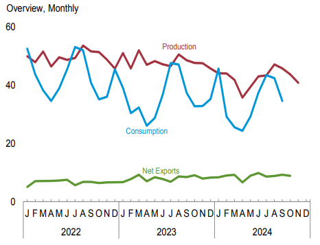 消費(fèi)方面,報(bào)告顯示,2024年9月份,美國煤炭總消費(fèi)量為3453.5萬短噸,同比下降7.52%,環(huán)比下降18.57%。