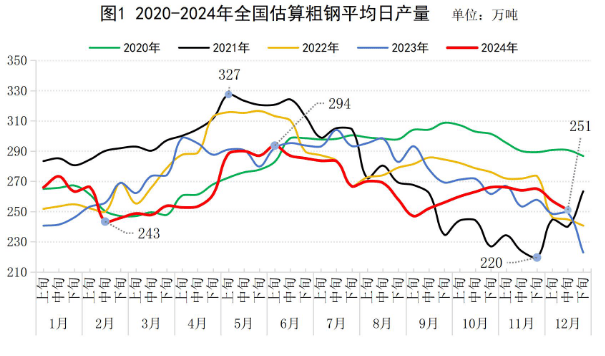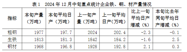 2024年12月中旬,重點(diǎn)統(tǒng)計(jì)鋼鐵企業(yè)共生產(chǎn)粗鋼1977萬(wàn)噸,平均日產(chǎn)197.7萬(wàn)噸,日產(chǎn)環(huán)比下降2.3%;生鐵1813萬(wàn)噸,平均日產(chǎn)181.3萬(wàn)噸,日產(chǎn)環(huán)比下降1.6%;鋼材1968萬(wàn)噸,平均日產(chǎn)196.8萬(wàn)噸,日產(chǎn)環(huán)比增長(zhǎng)2.1%(見表1)。
