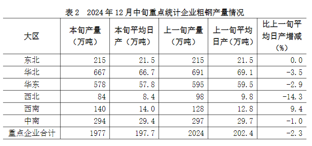 12月中旬六大地區(qū)中,除西南地區(qū)重點(diǎn)統(tǒng)計(jì)企業(yè)粗鋼日產(chǎn)量較上一旬增長(zhǎng)、東北地區(qū)粗鋼日產(chǎn)量較上一旬基本持平外,其它地區(qū)均有不同程度下降(詳見表2),具體為: