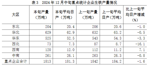 12月中旬六大地區(qū)中,除西南地區(qū)重點(diǎn)統(tǒng)計(jì)企業(yè)生鐵日產(chǎn)量較上一旬有所增長(zhǎng)外,其它地區(qū)均有不同程度下降(詳見表3),具體為: