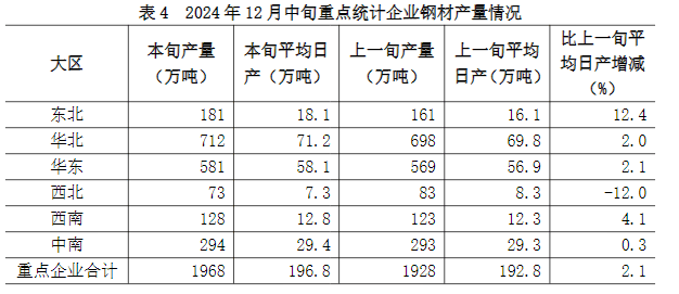 12月中旬六大地區(qū)中,除西北地區(qū)重點(diǎn)統(tǒng)計(jì)企業(yè)鋼材日產(chǎn)量較上一旬下降外,其它地區(qū)均有不同程度增長(zhǎng)(詳見表4),具體為: