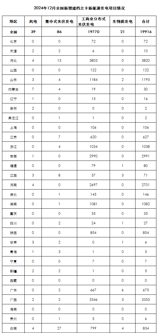 1月27日,國家能源局發(fā)布關(guān)于2024年12月全國新增建檔立卡新能源發(fā)電(不含自然人戶用光伏)項(xiàng)目情況的公告。