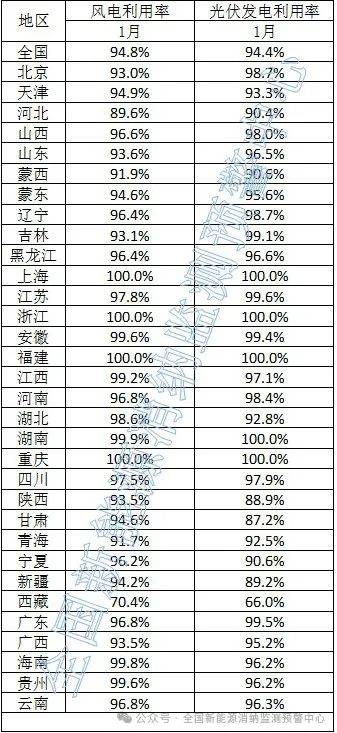 2025年3月3日,全國新能源消納監(jiān)測預(yù)警中心微信公眾號公布了各省級區(qū)域新能源并網(wǎng)消納情況。其中,2025年1月,光伏發(fā)電利用率光伏94.4%,風(fēng)電94.8%。