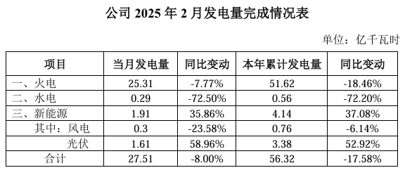 3月5日,長源電力發(fā)布公告,2025年2月,公司完成發(fā)電量27.51億千瓦時(shí),同比降低8.00%。其中火電發(fā)電量同比降低7.77%,水電發(fā)電量同比降低72.50%,新能源發(fā)電量同比增長35.86%。